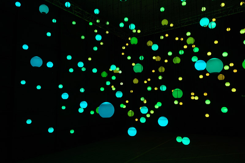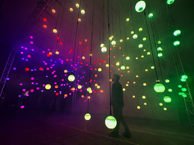 Enter Infinite and be surrounded by hundreds of illuminated spheres that form a symphony of notes. Colorful light and rich sound drift and flow in clusters throughout the space, composing an immersive ambient atmosphere that seems almost limitless. While wandering through the artwork, the sound of stringed instruments ripples out in waves and then disappears, creating a dynamic three-dimensional experience. The notes are programmed to be randomized and become longer as the composition develops, highlighting the unique quality of the instrumental tones. Infinite fosters an environment for each experience to be uniquely personal and intuitive yet also shared. Here, all are welcome to connect, explore, and bask in the wonder and emotion this immersive installation may spark.